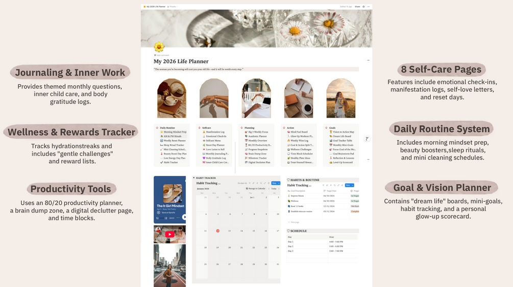 - Daily Routine: Create aligned, grounded days with morning mindset prep, quick to-dos, beauty boosts, sleep trackers, low-energy day plans, and weekly resets — all designed to build consistency without hustle.