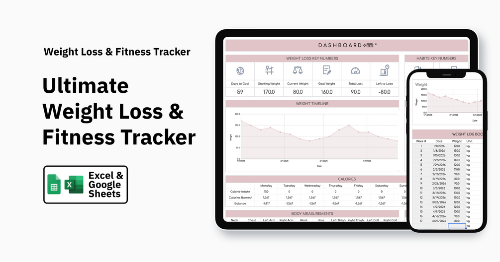 Stay consistent, track your progress, and reach your fitness goals with this all-in-one Weight Loss & Fitness Tracker Spreadsheet. Designed to be simple, powerful, and easy to use, this editable spreadsheet helps you monitor your weight, workouts, habits, and overall progress in one organized place.