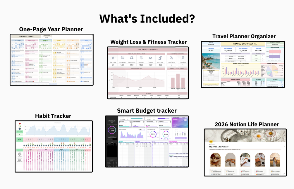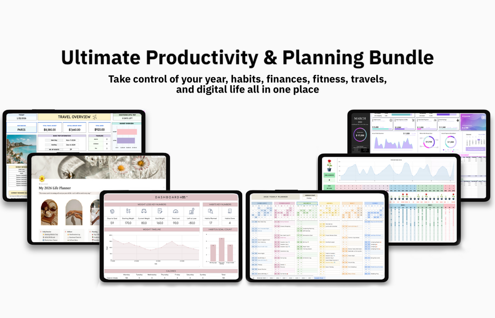 this bundle brings together all the tools you need to plan your year, build habits, manage your finances, organize trips, track your weight and fitness and streamline your life digitally.